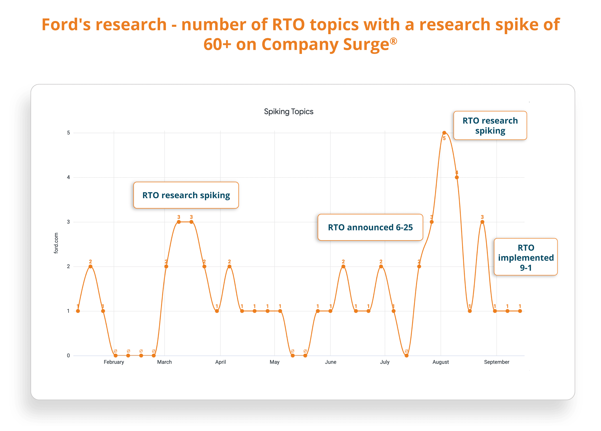 Inspired by Ford’s return to office (RTO) announcement, we took a look back to see if Company Surge® Intent data would have predicted this decision before it was made. We then looked at additional companies that had made 2025 RTO announcements and measured how often 6 topics related to return to work were spiking among these companies.